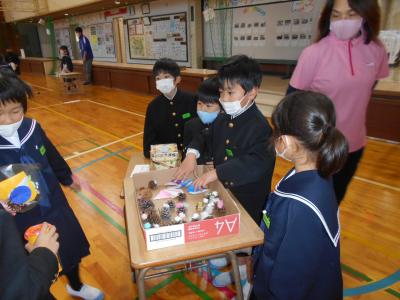 1年生が国語の授業で「ものの名まえ」を学習し、いろんな名まえのカードを使ってお店をオープンしました。