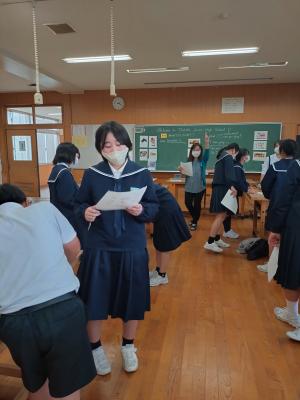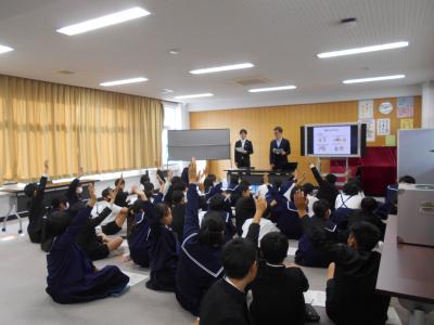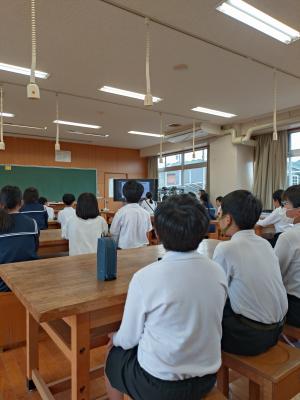 中学2年生の代表から中学生活についてのお話を聞いた後、1組は英語、2組は数学の授業を体験しました。