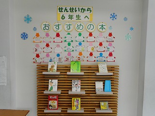 図書館前には、図書ボランティアのみなさんに作っていただいた素敵な掲示や本の紹介があります。現在は、ひなまつりにちなんだ本と学校職員が卒業生のみなさんに推薦したい本が展示されています。