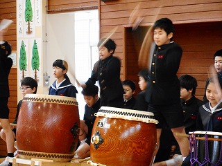 6年生を送る会での5年生の出し物には、太鼓演奏が含まれます。