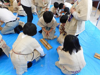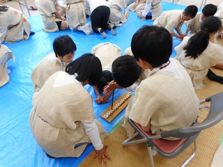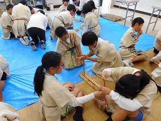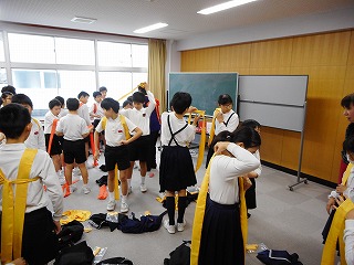 明日の6年生を送る会で5年生は太鼓演奏をしますが、その時にはちまき、たすきをして演奏します。はじめてたすき掛けをするので、協力して練習しました。