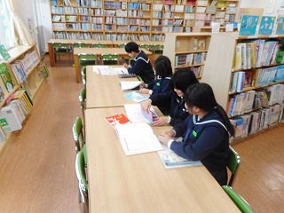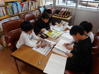 画像は4年2組の皆さんが図書館で調べている様子です。