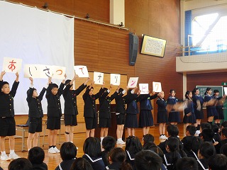 あさって、新1年生を迎える会があります。この会は、現在の1年生がお世話をします。4限目に、そのための練習を体育館でしていました。