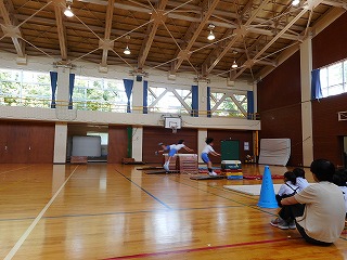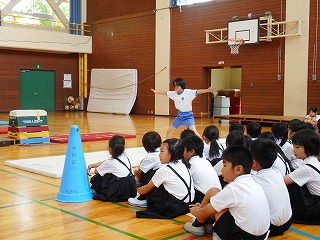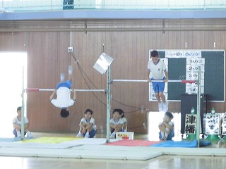 4年生は、マット、跳び箱、鉄棒のいずれかの演技をしました。演技だけでなく、大きな声で自分の名前を言うことができていました。