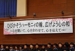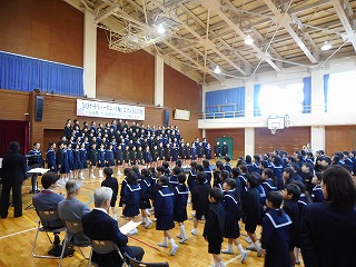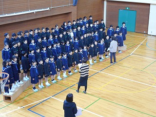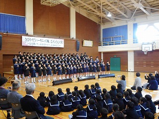 ハーモニーの輪が広がりました! 投稿日時 : 2018/11/10 教頭 2,3限目に「ひびかそうハーモニーの輪、広げよう心の和」のスローガンのもと、音楽集会が行われました。1,2年生は音楽物語「くじらぐも」。天まで届くくらいの元気な声で歌いました。3,4年生は音楽物語「一つの花」。気持ちをこめて歌っていました。5,6年生は二部合唱「Can Do」、三部合唱「ふるさと」。とても響いて感動しました。最後に、保護者の方もみんなで「ふるさと」を歌いました。低学年の「くじらぐも」中学年の「一つの花」高学年の合唱「Can Do」「ふるさと」全校合唱「つないで歌おう」