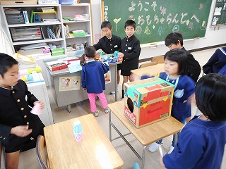 年長さんをおもちゃランドに招待したよ! 投稿日時 : 2018/11/19 教頭 2年生のみなさんが太白台保育園の年長さんを、おもちゃランドに招待しました。おもちゃランドには、2年生のみなさんが考えた楽しいゲームがたくさんありました。年長さんはとても楽しそうでした。