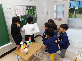 平成最後の太白っ子フェス 投稿日時 : 2018/12/18 中学年 「平成最後の太白っ子フェス」がありました。今回は、プログラム委員会の運営の下、5年生がリーダーシップをとって活動しました。なかよしグループごとに考えた遊びを、他のなかよしグループが楽しむイベントです。5年生が中心となって考えた遊びの内容は、クイズやボーリング、ピンポン玉運びなど様々で、どのグループもお店屋さんのようにいろいろな場所に訪れ楽しんでいました。