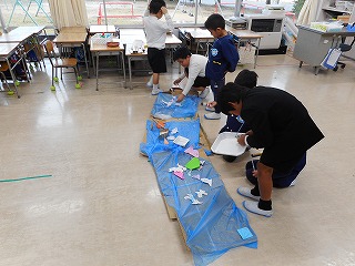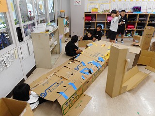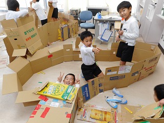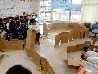 だんだん段ボール! 投稿日時 : 2018/11/22 教頭 2年生が、段ボールを立てたり、つないだり、切ったりして楽しみました。トンネル、ベッド、家などおもいおもいに作っていました。みんなで大作を完成させ、満足していました。