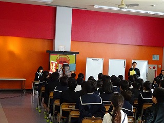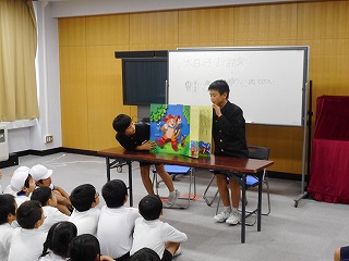 太白っ子お話会がありました! 投稿日時 : 2018/12/06 教頭 昼休みの時間に、図書委員会のみなさんによる本の読み聞かせがありました。大型紙しばいをつかって気持ちをこめて読んでいました。たくさんのみなさんが聞きにきていました。