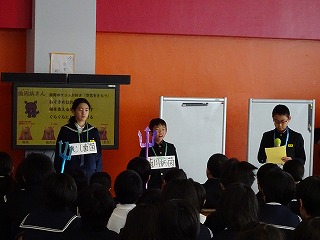 歯と口の健康を守るために・・・ 投稿日時 : 2018/12/10 低学年 本日10日(月)に5・6年生及び保護者の方を対象に学校保健委員会が開かれました。児童の司会進行のもと、劇の形式で楽しく歯と口の健康について考えたり、保護者の方のアンケート結果や沖野先生からのお話がありました。児童の感想の中には、「フロスを使って健康を守りたい。」とありました。是非ご家庭でもフロスを活用して歯と口の健康を守ってみる機会になるといいですね。