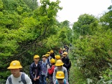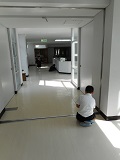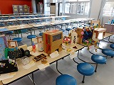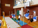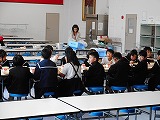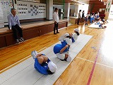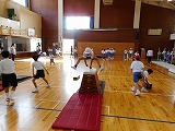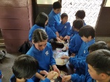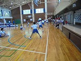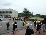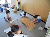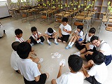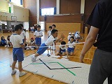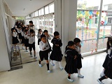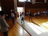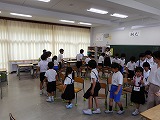 3年生が廊下の長さを巻尺で測っていました。班で協力できていました。