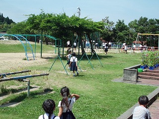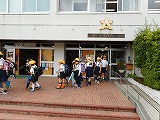 | 児童玄関前のチューリップ | 運動場の桜(6年生が写真撮影をしています) |