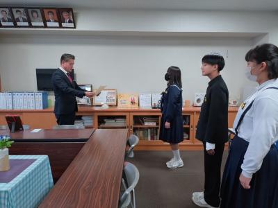6年児童が代表として、図書委員から賞状を受け取りました。