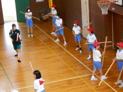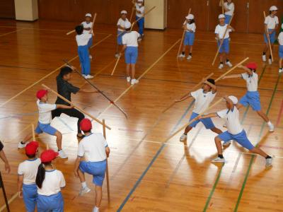 高学年は今年も運動会で棒振りをします。今日は6名の青年団の方に、棒振り・獅子舞・太鼓・笛の指導をしていただきました。