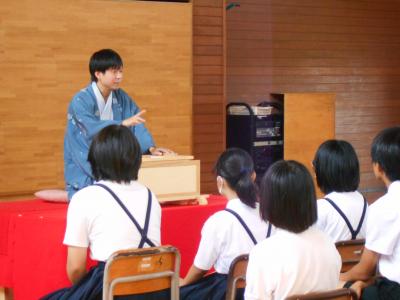 一人で何役もする月亭方気さんに引き込まれ、体育館は笑いに包まれていました。