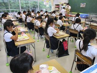 6月1日より学校が再開され、給食もスタートしました。1年生にとっては、小学校で初めての給食です。ランチルームで食べている姿を写真に撮りました。