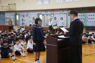 社会を明るくする運動標語コンテスト、MOA美術館児童作品展、リサイクル工作コンクール、図書館を使った調べる学習コンクール、読書感想文コンクール、郡市書写作品展、郡市図画作品展、校内マラソン大会など、たくさんの表彰がありました。