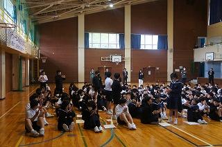 中学2年生の代表から中学生活についてのお話を聞いた後、1組は英語、2組は数学の授業を体験しました。