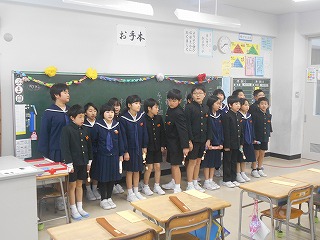 二分の一成人式(4年) 投稿日時 : 2020/02/06 中学年 本日、二分の一成人式がありました。「伝える」を目標に、歌・決意・手紙・プレゼントを通して子どもたちが心の中で思っていることをお家の人に伝えることができました。ぜひ、ご家庭でも今日のことについて話し合って下さい。最後になりましたが、大変お忙しい中、学校に来てくださってありがとうございました。
