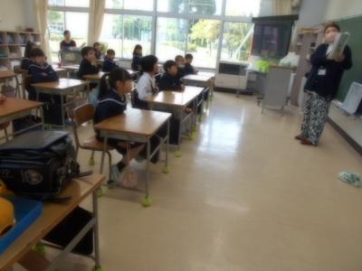1年生は、クイズをまじえたお話を聞き、実際に通学路を歩きました。