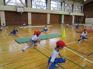 とびとびオリンピックに向けて 投稿日時 : 2018/11/30 教頭 2年生は体育の時間に「とびとびオリンピックを楽しもう」という学習をしています。今日は、とびとびオリンピックの種目(ロングジャンプ、トリプルジャンプ、ハイジャンプ、タッチジャンプ)の練習をしました。それぞれの種目の「できるポイント」に気をつけて練習し、友達にアドバイスをしながら練習していました。