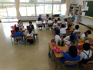 おいしかったお弁当! 投稿日時 : 2019/04/19 教頭 遠足が延期になってちょっと残念そうでしたが、楽しそうにお弁当を食べていました。どのクラスも、給食を食べるときとは違った並び方で仲良く食べていました。