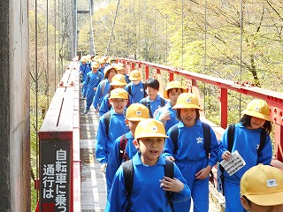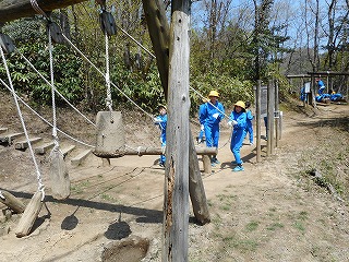 フィールドアスレチックをしたよ! 投稿日時 : 2019/04/22 教頭 高学年は遠足で森林公園に行き、フィールドアスレチックをしました。5,6年生混合の委員会のメンバーでまわりました。協力しながら楽しめました。途中、つり橋を渡りました。揺れてすこしこわかったようです。