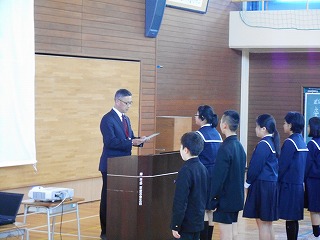 任命式がありました! 投稿日時 : 2019/05/07 教頭 5限目の集会で、委員会の委員長のみなさん、3年生以上の学級代表のみなさんの任命式がありました。委員会のみなさんはがんばることを一人ずつ話しました。学校、委員会、クラスがよりよくなるように頑張る気持ちが伝わってきました。