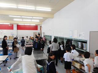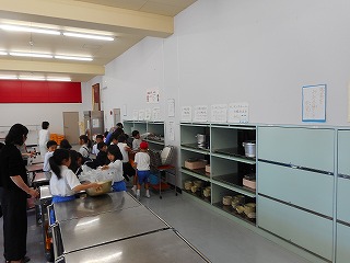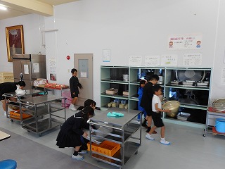 上手に後片付けをしています 投稿日時 : 2019/05/08 教頭 朝は寒かったですが、今日もとてもいい天気です。給食を食べ終わったら、ワゴンを食堂に運びます。食堂では、お盆や食器を棚に入れたり、ワゴンを拭いたりします。給食委員会のみなさんも手伝いながら、どのクラスもきちんと後片付けをしています。
