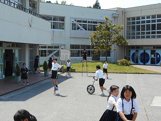 一輪車、竹馬、上手にできるよ! 投稿日時 : 2019/05/13 教頭 長休み、3年生女子のみなさんが一輪車、5年生男子のみなさんが竹馬を上手にできていました。落ちたり、転んだりすることをおそれずに取り組んでいました。天気も良く、運動場ではサッカーをしたり、ブランコに乗ったりと元気よく遊んでいました。