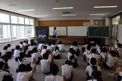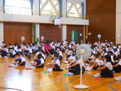 児童集会の中で、保健委員会より熱中症についてのお話がありました。熱中症にならないための対策や、実際になってしまったときの対処法を、クイズをまじえてわかりやすく発表してくれました。