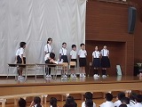 1学期がんばりました! 投稿日時 : 2018/07/20 教頭 今日は、1学期最後の日、とても暑い中、最後までがんばりました。1学期最後なので、お楽しみ会をしたクラスも多かったです。児童集会では、運動会の応援団の紹介、スローガンの紹介、5年1組さんからの劇、図書委員会の皆さんからの表彰、5年生のみなさんの合唱などがありました。終業式では校長先生のお話や、夏休みの過ごし方についてのお話がありました。4年1組のみなさんのお楽しみ会運動会応援団のみなさん(左)運動会スローガン「ONE HERAT]図書委員会のみなさんによる表彰(左)5年1組のみなさんの劇(右)5年生のみなさんによる合唱