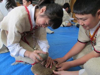 6年考古学講座 投稿日時 : 2016/05/06 高学年 4月27日に出前考古学講座をしていただきました。縄文時代の人になりきって、まずは貫頭衣を着ました。似合うでしょ? 次に石器で紙を切ったり、石で胡桃を割って食べたりしました。石器の切れ味のよさにびっくり!胡桃はなかなか割れませんでした・・・でも、頑張って割った胡桃はおいしかったです!最後は火起こしです。火起こしはとても難しく、手に豆ができている子もいました。便利な今の時代と比べ、縄文時代の人は火を起こすのにもこんなに苦労していたんですね。縄文時代の暮らしに触れるいい機会になりました!