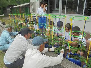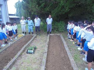 地域のボランティアの皆さんに来ていただき畑に野菜を植えました。