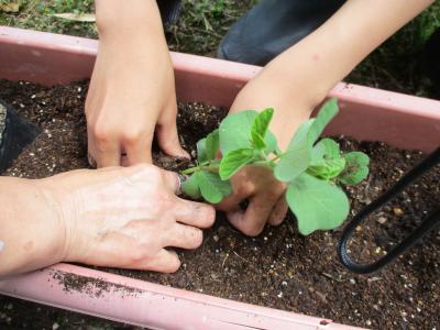 みんなで種をまいた枝豆が大きくなってきたので、ポットからプランターに植えかえました。