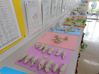 いきもののおやこ 投稿日時 : 2019/07/23 教頭 1年2組のみなさんは2限目に、ねんどでいきもののおやこを作りました。きょうりゅうやへび、うさぎなどをくふうして作っていました。楽しそうでした。