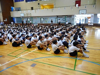 開閉会式練習をしました! 投稿日時 : 2019/09/18 教頭 3限目に、全校で開閉会式の練習をしました。実際に、椅子を児童席に並べて行いました。開閉会式で、自分が立つ位置や準備体操の動きを確認しました。