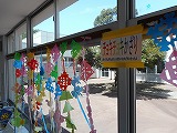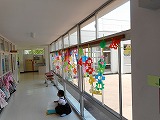 1年教室前廊下には、図工で作ったチョキチョキかざりの作品が掲示されています。いろいろな模様があってきれいです。