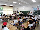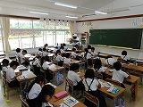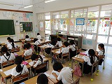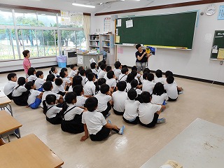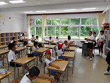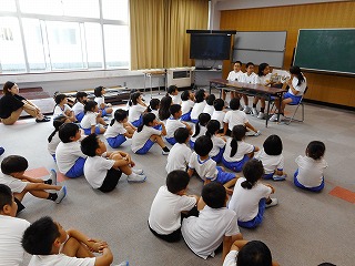 朝は図書ボランティアの皆さんに、読み聞かせをしていただきました。大雨の中、ありがとうございました。2年生は1,2組合同で聞きました。「おにのきもだめし」などの本の読み聞かせをしていただきました。