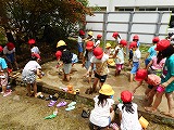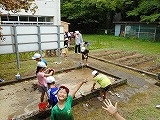 1年生のみなさんが、生活科の時間にどろんこ遊びをしました。あらかじめ汚れてもいい服を持ってきていました。水をふくんだ泥の感触を楽しみながら学習していました。