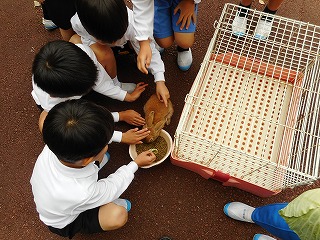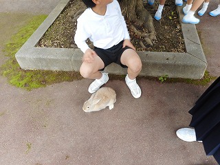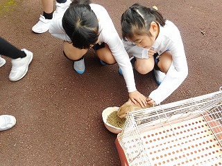 ウサギとふれあいました! 投稿日時 : 2019/11/22 教頭 昨日と今日の昼休み、動物委員会のみなさんが、ウサギと触れ合う時間を作ってくれました。中庭で、ウサギを抱っこしたり、エサをあげたりしました。みんな、抱っこができて、とても喜んでいました。