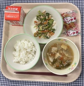 今日の給食献立は、白ごはん・鶏ささみのさっぱりサラダ・大根とひき肉のうま煮・たい焼き・牛乳でした。