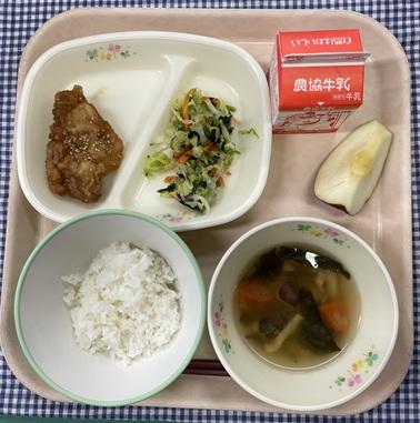 今日の給食献立は、白ごはん・若鳥のごまからめ・磯香和え・珠洲産さつまいものみそ汁・珠洲産りんご・牛乳でした。