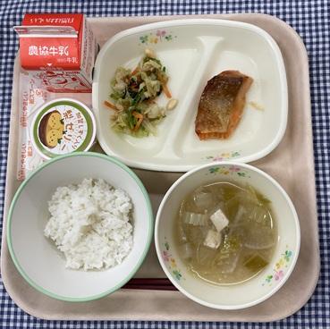 今日の給食献立は、白ごはん・鮭のみそ焼き・小松菜と珠洲産大豆のごま和え・野菜と珠洲産干しシイタケのかす汁・加賀しずくゼリー・牛乳でした。