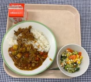 今日の給食献立は、麦ごはん・ポークカレー・ブロッコリーとチーズのサラダ・牛乳でした。