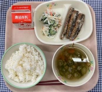 今日の給食献立は、白ごはん・いわしの竜田揚げ・いかくんサラダ・おくらともずくのスープ・牛乳でした。