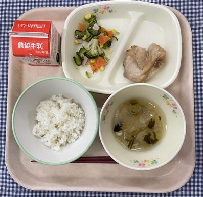 今日の給食献立は、白ごはん・鶏肉のレモンソースがけ・カラフルサラダ・大根のコンソメスープ・牛乳でした。
