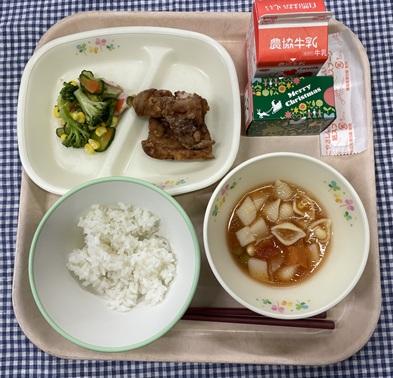 今日は2学期最後の給食です。そして、みんなが楽しみにしているクリスマス給食です。とっても豪華で彩も美しいです。給食を提供していただきている飯田小学校共同調理上の皆様に感謝の気持ちでいっぱいです。