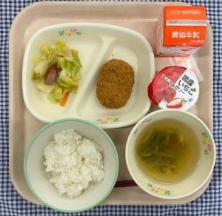 今日の給食献立は、白ごはん・メンチカツ・大根とハムのサラダ・ブロッコリーのコンソメスープ・牛乳でした。