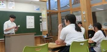今年度初めてのミニビブリオバトルが行われました。今年度は、児童生徒会の企画委員会が計画・運営を行います。今日は2名の生徒によるバトルが行われました。どちらの生徒も本をお勧めしたい理由やどのような人におすすめなのか、自分はどんなところが心に響いたのかなどをわかりやすく発表しました。バトルなのですが、勝敗はつかず、両方の発表を称えて終わりました。どちらの本も読んでみたいと思います。